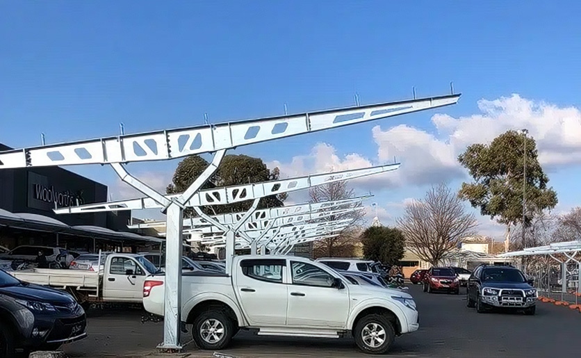 Ideal for larger car parking areas requiring shade and solar power. The structure can be adapted to cover any area size.