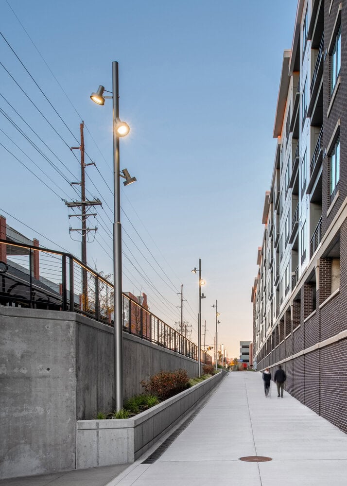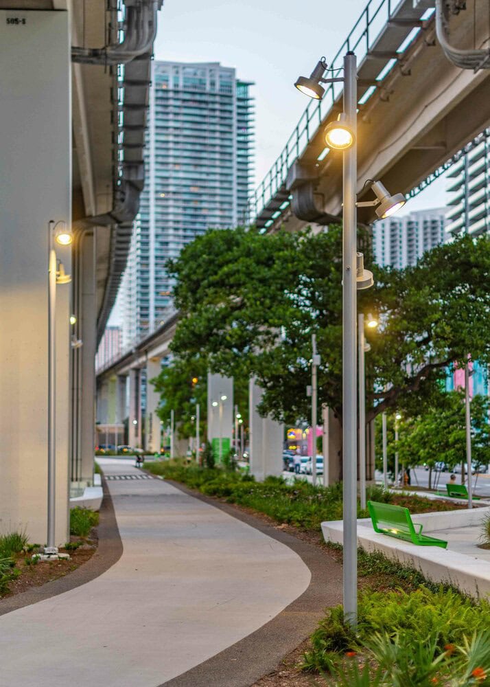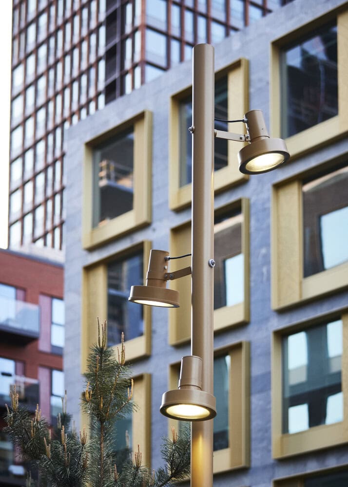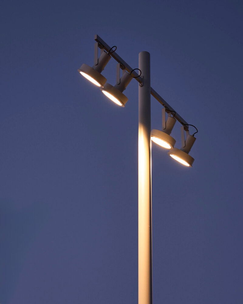 Column lighting is the most well-organized, functional option for urban projects. It harmonizes layouts from a technical perspective, with good rates of uniformity and suitable lighting values. Single or double accessories for up to six floodlights at different heights, allowing the light to be directed wherever necessary, due to the three axes of rotation.